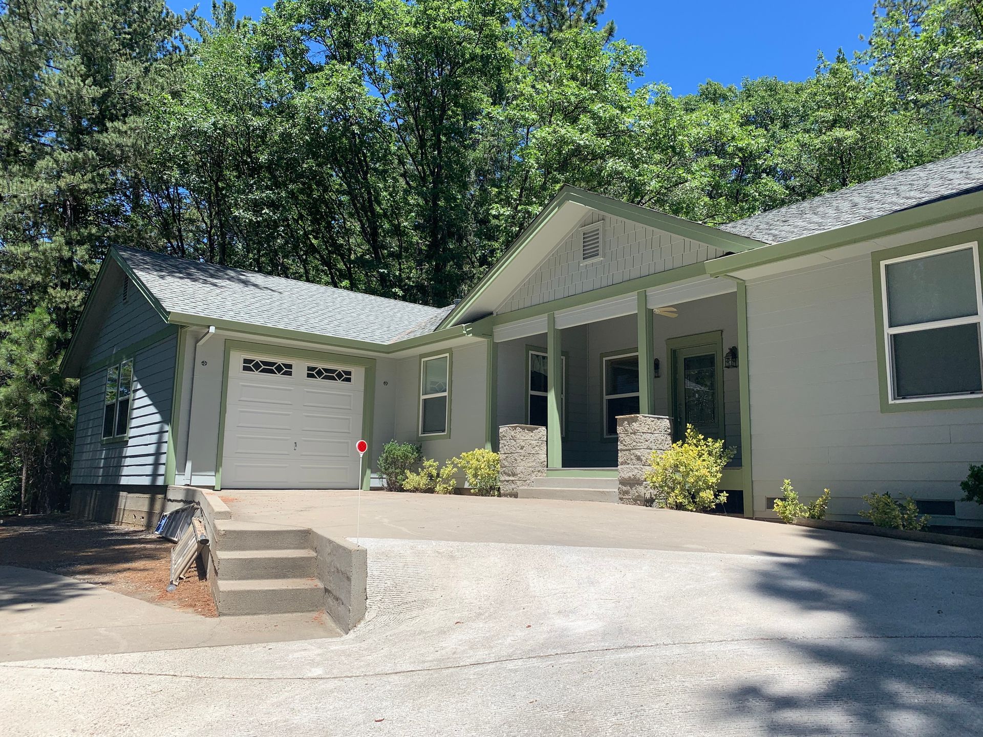 White house with blue trim, bay window, and path leading to the front door. Green grass and trees surround it.