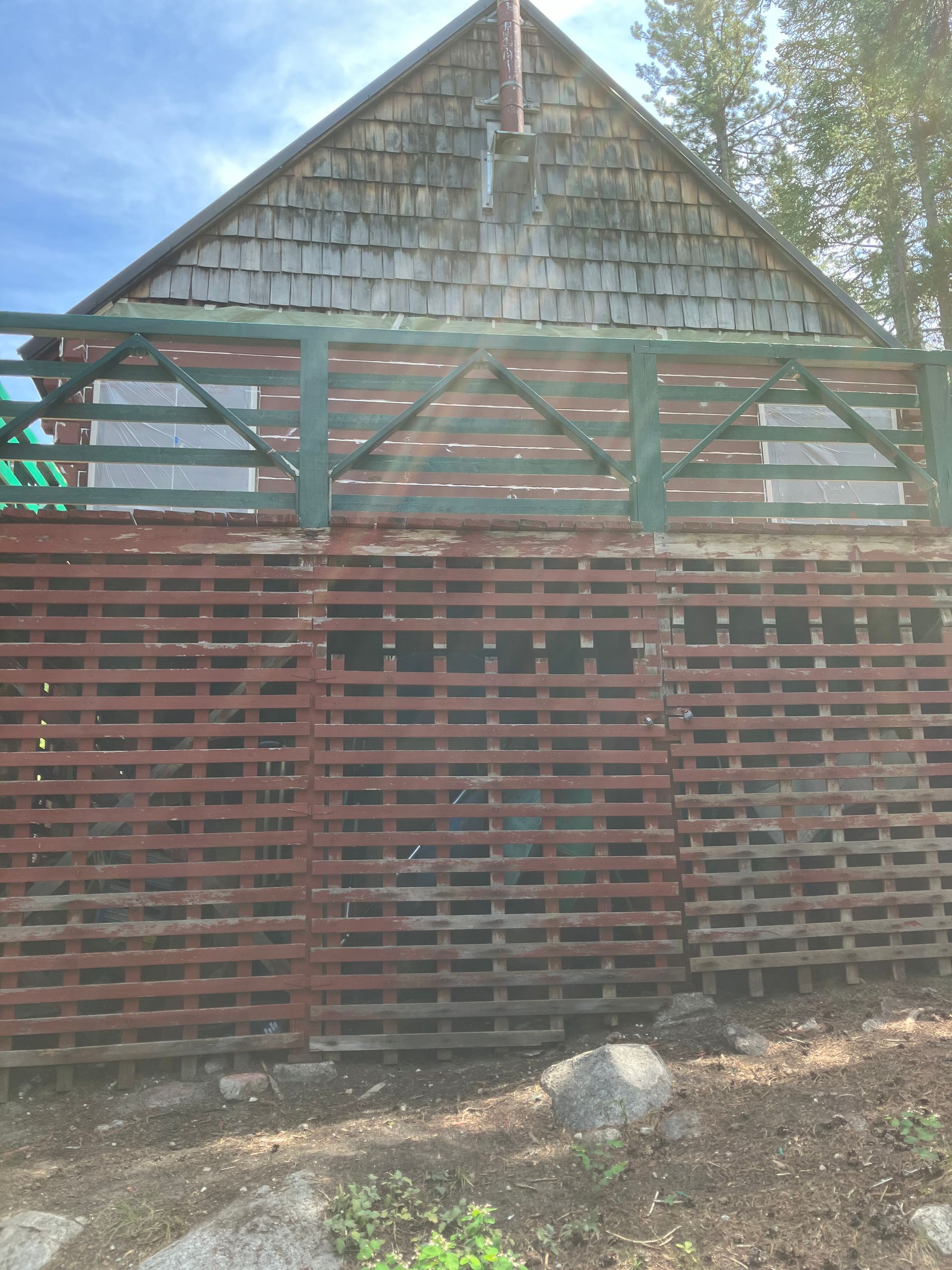 Red wooden cabin on a rocky hillside with stairs and a deck, surrounded by trees.